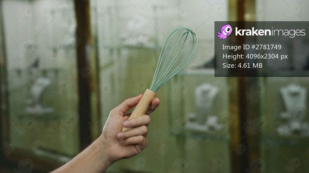 Man holding whisk in front of jewelry showcase in store captures unique indoor juxtaposition.