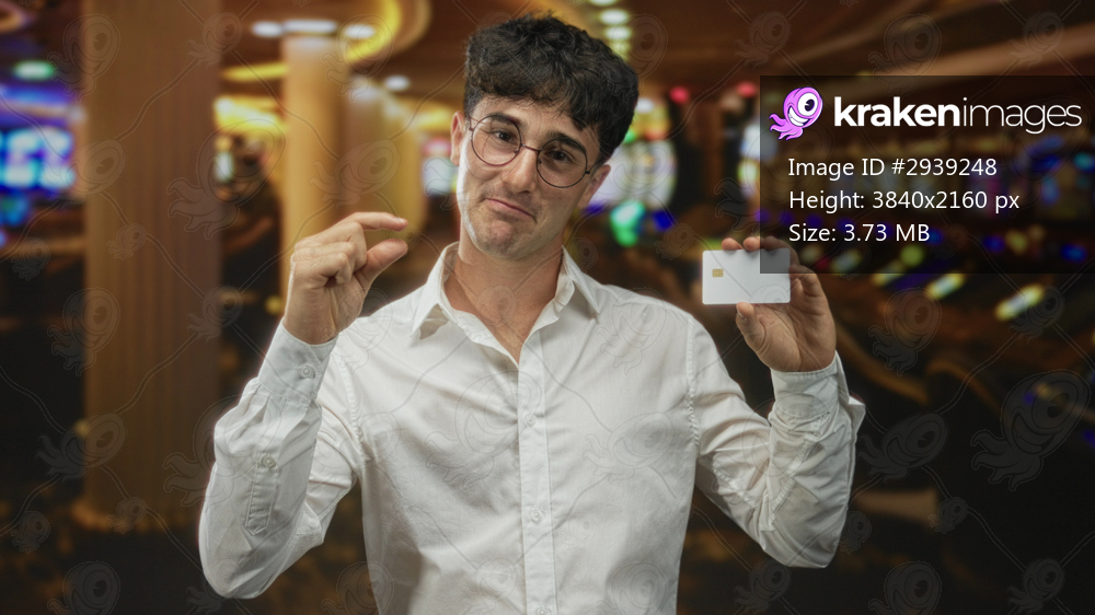 Man holding white card between thumb and forefinger, pinching fingers to show small amount in casino building; luck confidence.