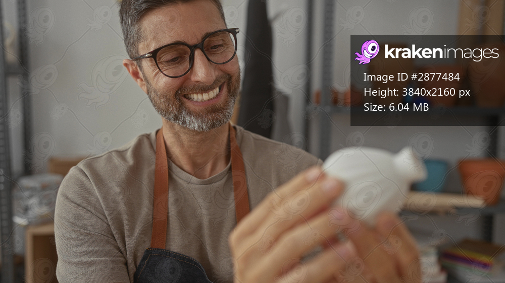 Man holding white ceramic vase in studio shelves with hands, smiling while inspecting a small pot; serenity craft skill.
