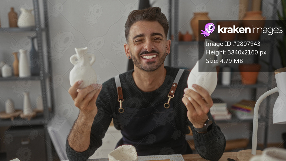 Man holding white ceramic vase and smiling in a studio; creativity craftsmanship inspiration passion.