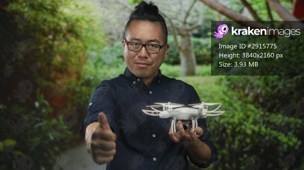 Man holding white drone and gives thumbs up with right thumb in forest park while smiling at camera and holding quadcopter camera; tech hobby confidence. - Kraken Images