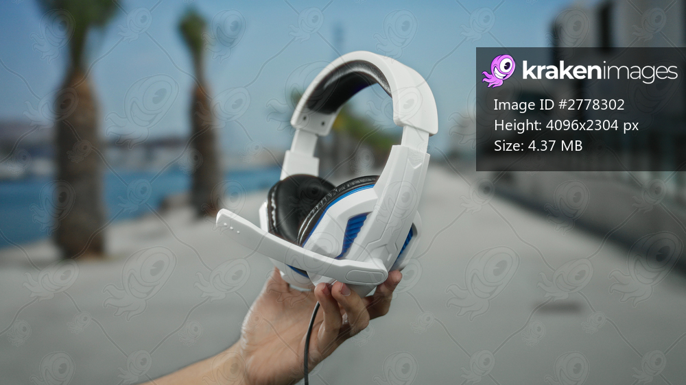 Man holding white headphones in hand on promenade by beach with palm trees in background under clear blue sky signifying outdoor leisure at seaside location. - Kraken Images
