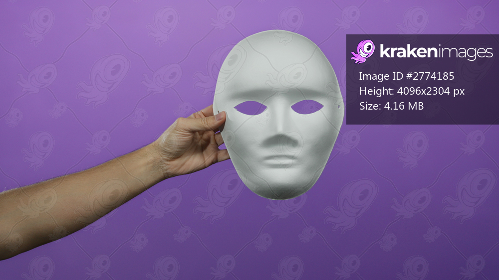 Man holding white mask against purple background, highlighting identity and disguise concepts with male hand prominently featured in the center of the frame. - Kraken Images