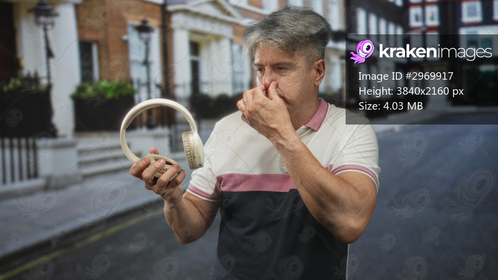 Man holding wireless headphones pinches his nose while inspecting the earcup on a street lined with townhouses; odor disgust.