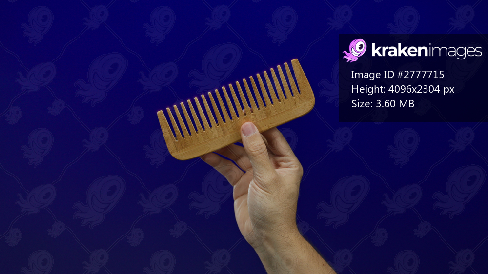 Man holding wooden comb against blue background, showcasing eco-friendly grooming product with caucasian male hand in focus, highlighting sustainability and personal care. - Kraken Images