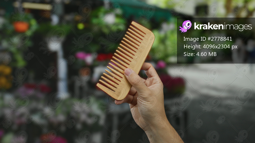Man holding wooden comb at outdoor flower shop with blurred city street background, showcasing eco-friendly lifestyle and urban shopping scene.