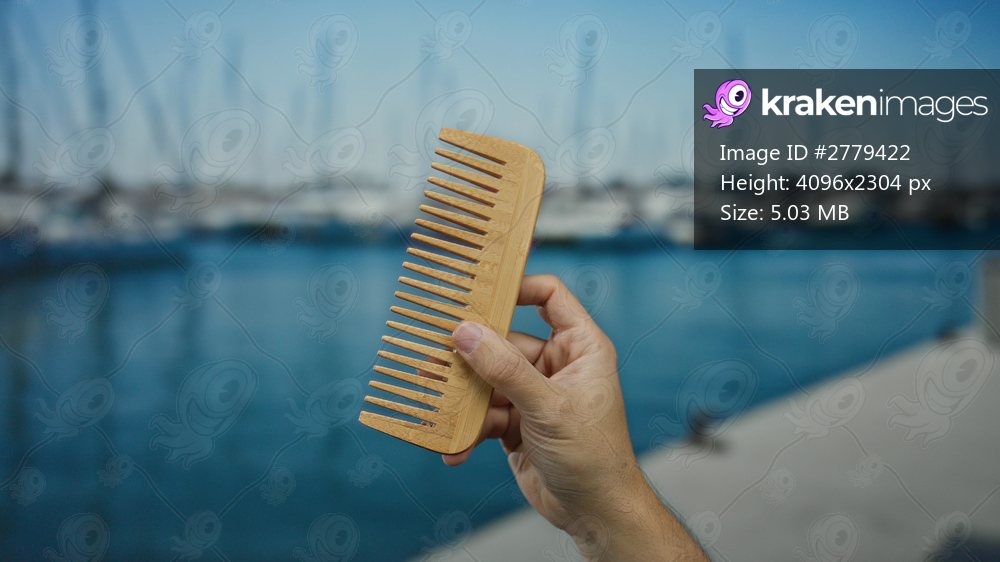 Man holding wooden comb by the seaside with blurred boats in the background at a port, highlighting outdoor maritime scenery.