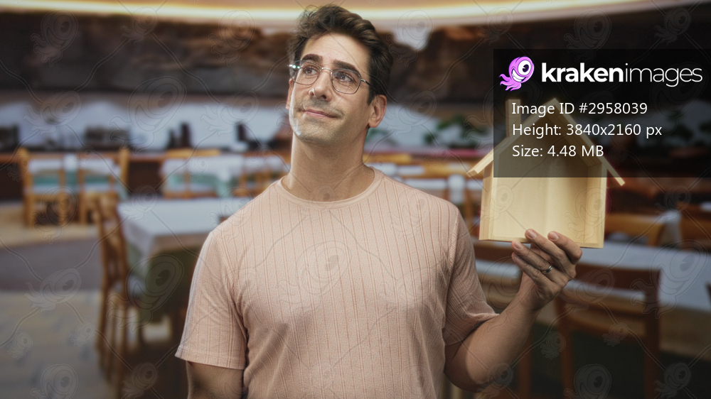 Man holding wooden house model in a restaurant building, slight smile and glasses while presenting the open interior; home buying hope.
