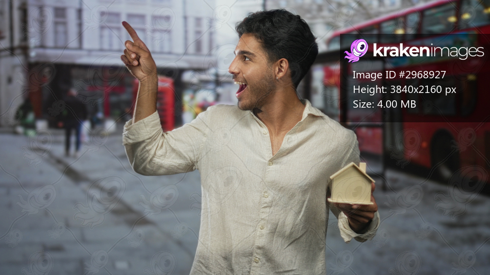 Man holding wooden house model, pointing and smiling on a city street with red bus and phone booth; homeownership hope.