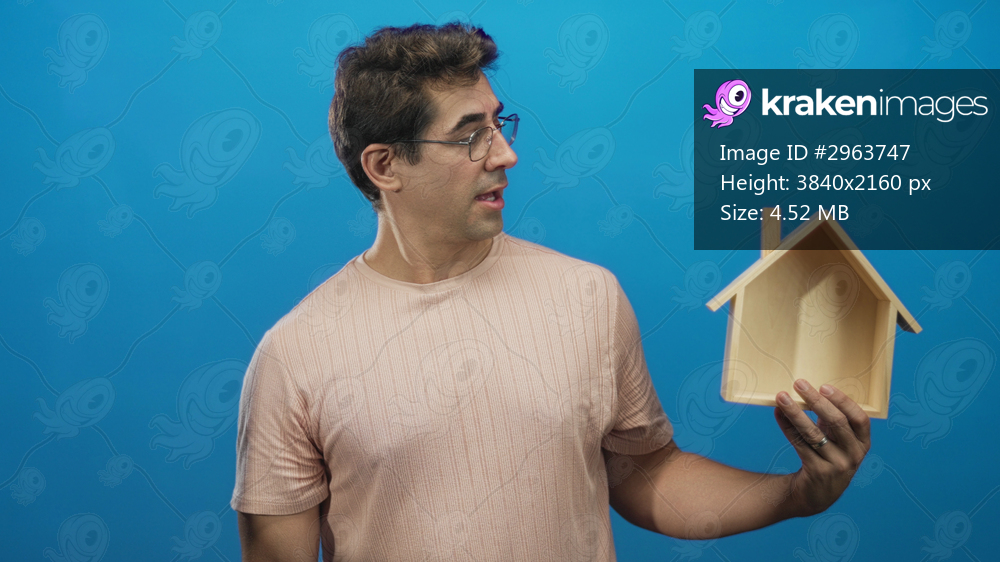 Man holding wooden house model with right hand while slightly smiling and tilting head, looking to side against vivid blue studio backdrop; homeownership trust. - Kraken Images