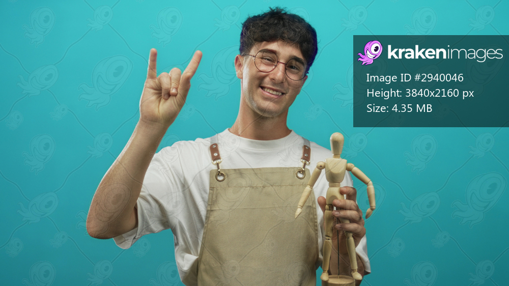 Man holding wooden mannequin and making rock horns gesture in turquoise studio; playful creativity imagination.