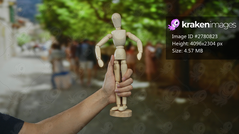 Man holding wooden mannequin on city street with blurred background of people and trees, illustrating art and creativity outdoors in urban setting.