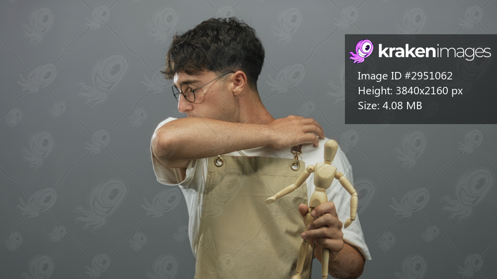 Man holding wooden mannequin sneezes into elbow in studio with gray wall, wearing apron and glasses; hygiene caution.