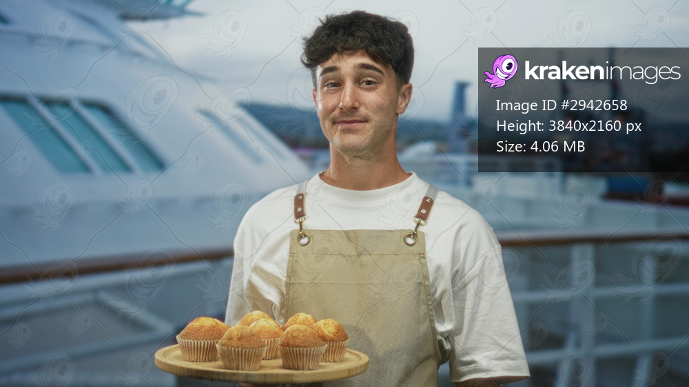 Man holding wooden tray of muffins and smiling while wearing apron on cruise ship building deck; warm hospitality friendly.