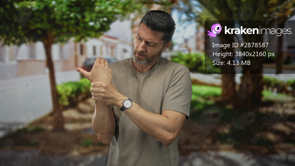 Man holding wrist and inspecting it while wearing watch in park street under trees and sunlit greenery; pain recovery.