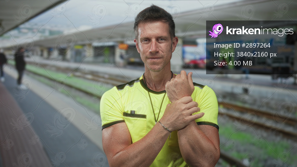 Man holding wrist and looking down at forearm in a train station wearing yellow referee shirt; concern duty.