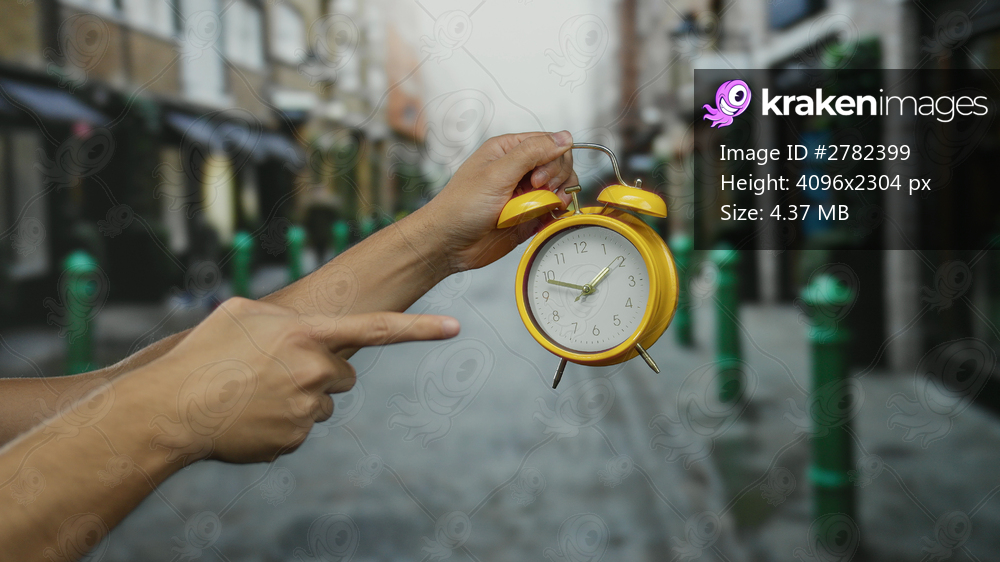 Man holding yellow clock in hand on city street pointing at time indicating urgency concept in urban outdoor environment with blurred background for modern lifestyle context. - Kraken Images