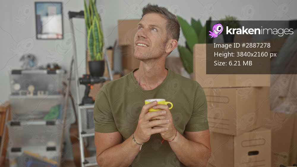 Man holding yellow mug with both hands and looking up amid cardboard moving boxes, ladder, potted plant and storage tubs inside building; contentment new beginning. - Kraken Images