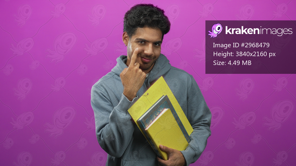 Man holding yellow notebooks with finger to eye in studio wearing a grey hoodie and smiling against purple backdrop; playful confidence.