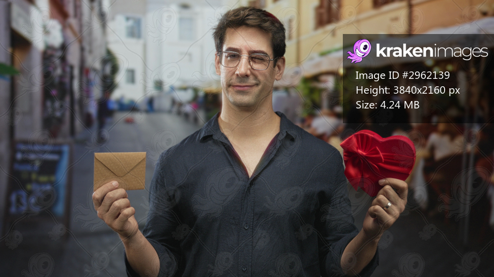Man holds a brown envelope in his left hand and a red heart gift box in his right hand on a cobbled street cafe; romance offering.