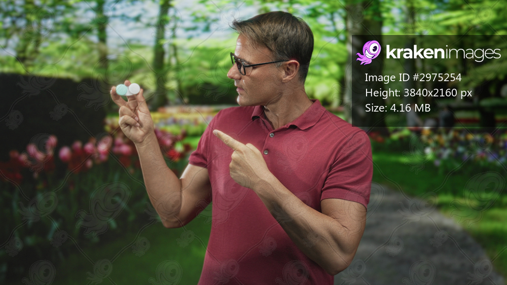 Man holds a contact lens case between thumb and forefinger and points finger to the small round case while standing on a tree lined path in forest; confidence eye care simplicity. - Kraken Images