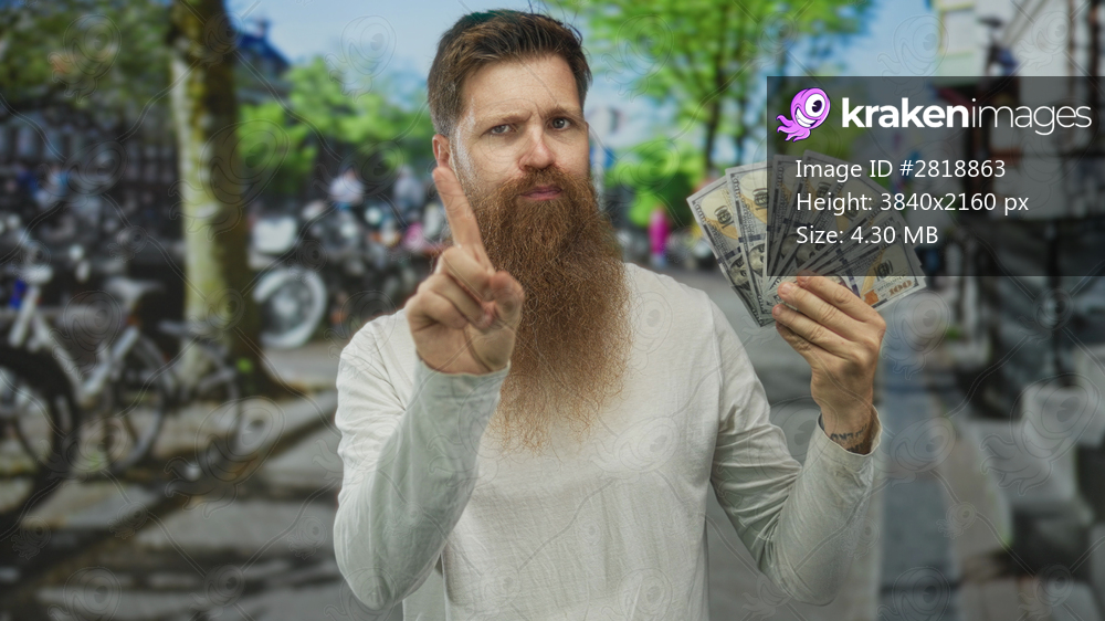 Man holds a fan of cash in one hand and points finger upward with a determined look on street; greed temptation.