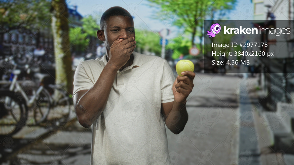 Man holds a green apple and covers mouth with hand while wincing and grimacing on a sunny city street lined with bicycles and trees; disgust hesitation. - Kraken Images