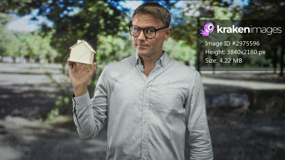 Man holds a miniature wooden house with right hand in a forest setting, wearing glasses and a button shirt, slight smile; investment confidence.