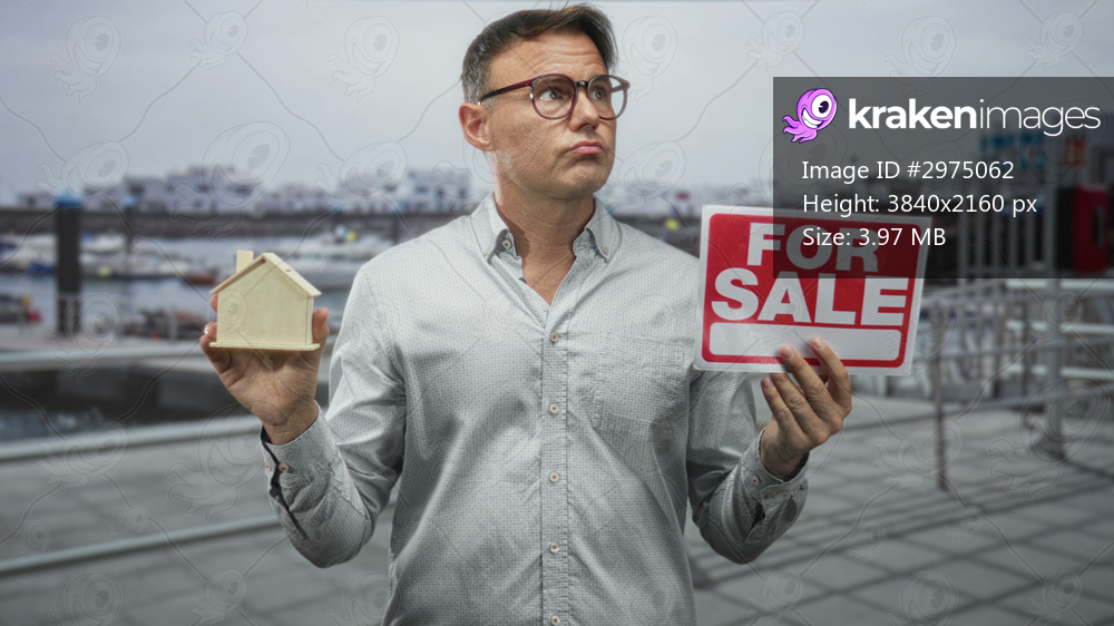 Man holds a small wooden house model and a for sale sign in building plaza, hands visible and wearing glasses; uncertainty decision.