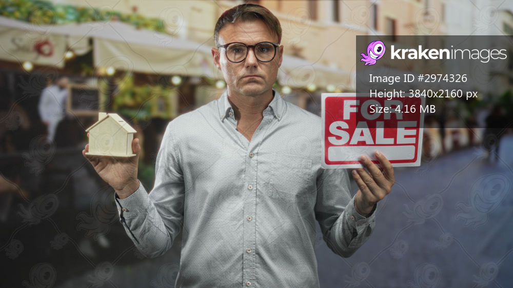 Man holds a wooden house model in one hand and a for sale sign in the other on a busy street; concern decision sale.
