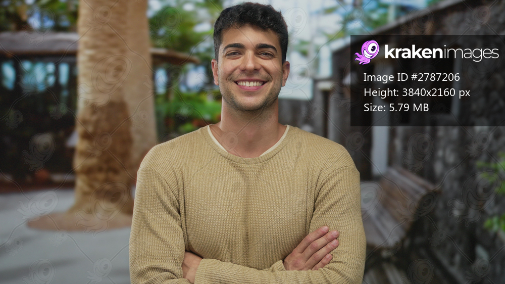 Man holds arms across chest and smiles outdoors showing young hispanic style over crossed urban benches with a calm grin portrait.