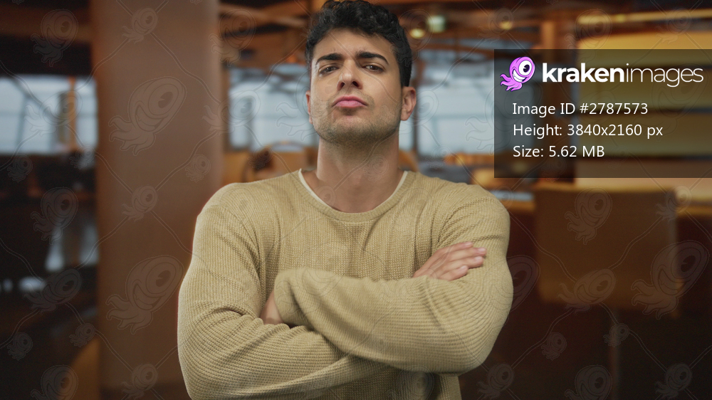 Man holds arms crossed in restaurant scene where guy hispanic young lounge skeptical cafe mood emerges.