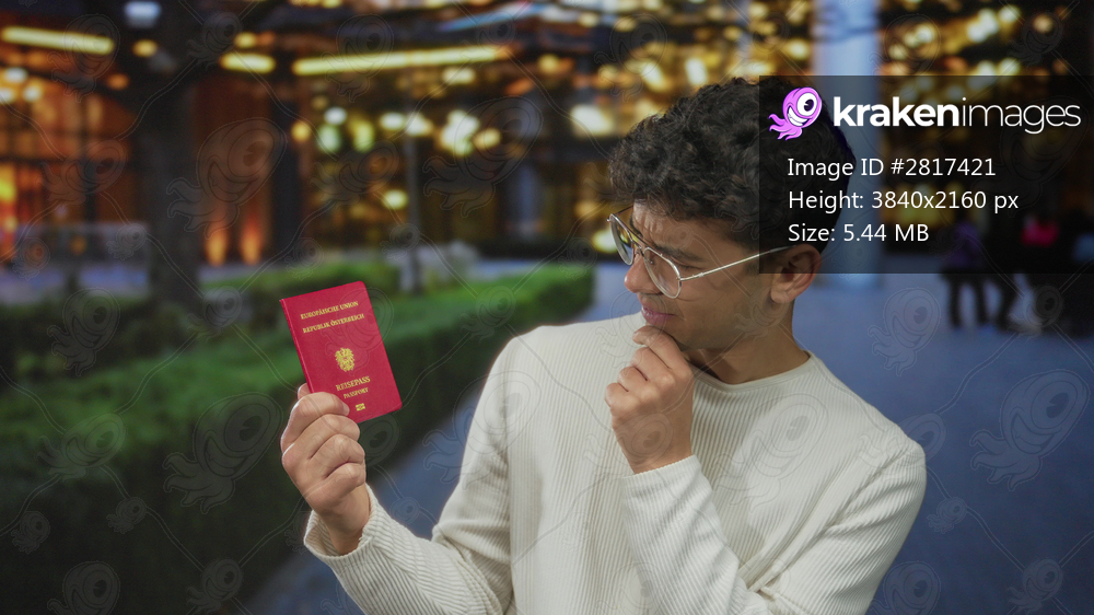 Man holds austrian passport and visa while resting hand on chin gesture in street; hesitant travel uncertainty.