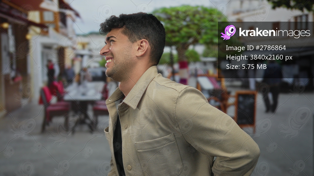 Man holds back while he leans against street sign beside hispanic young guy near cafe, trying to mask pain and discomfort.