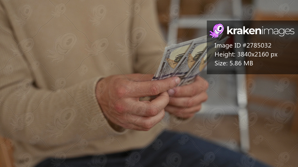 Man holds bills with hands while counting in home, young hispanic unpacking new boxes full of cash inside house.