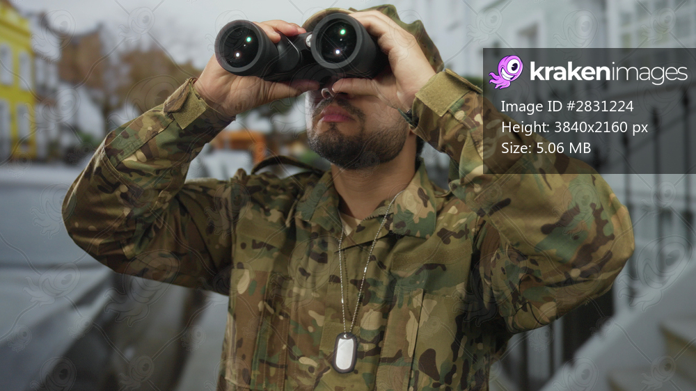 Man holds binoculars against camouflage uniform and scans row of buildings on a city street outdoors; vigilance.