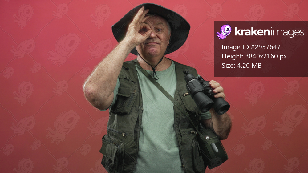 Man holds binoculars and makes ok sign over eye while wearing hat and vest in studio; curiosity adventure.