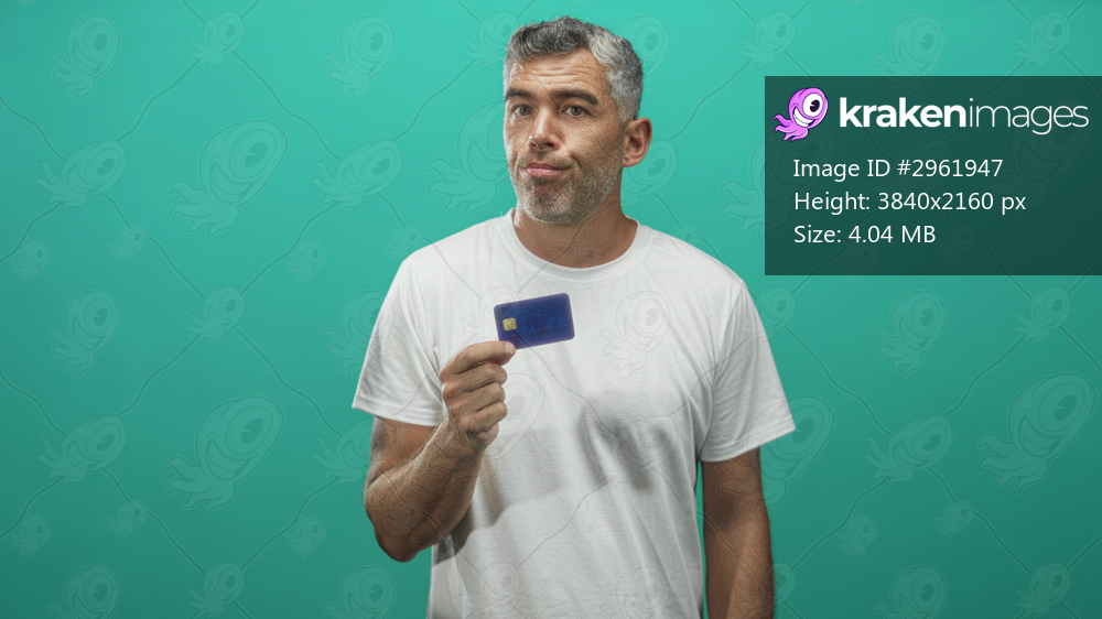 Man holds blue creditcard between fingers in a studio teal backdrop, white tshirt visible, hand raised and lips pursed showing uncertainty; financial concern. - Kraken Images