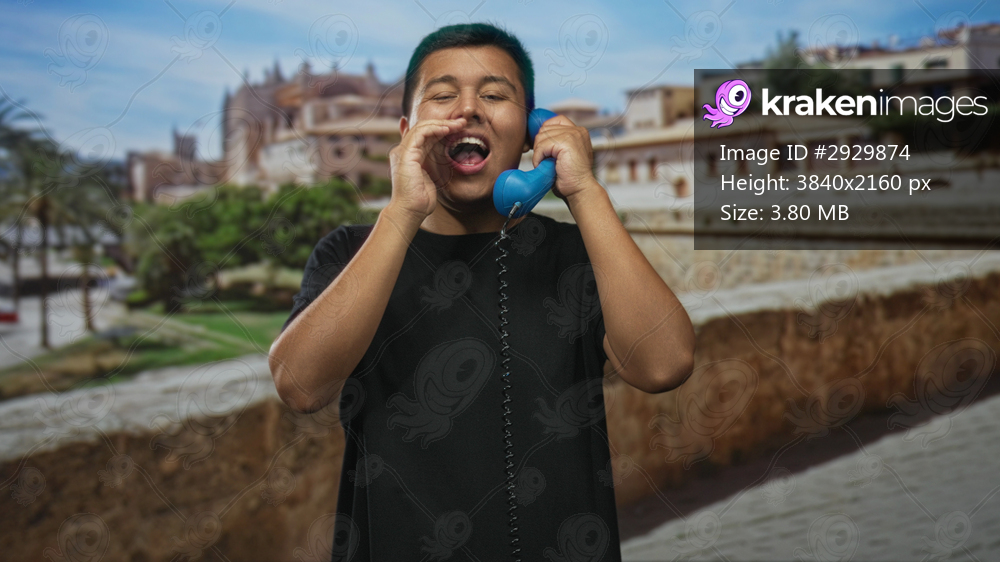 Man holds blue handset to his ear and whistles on a street by a stone wall and historic building in an old town plaza; playful joy.