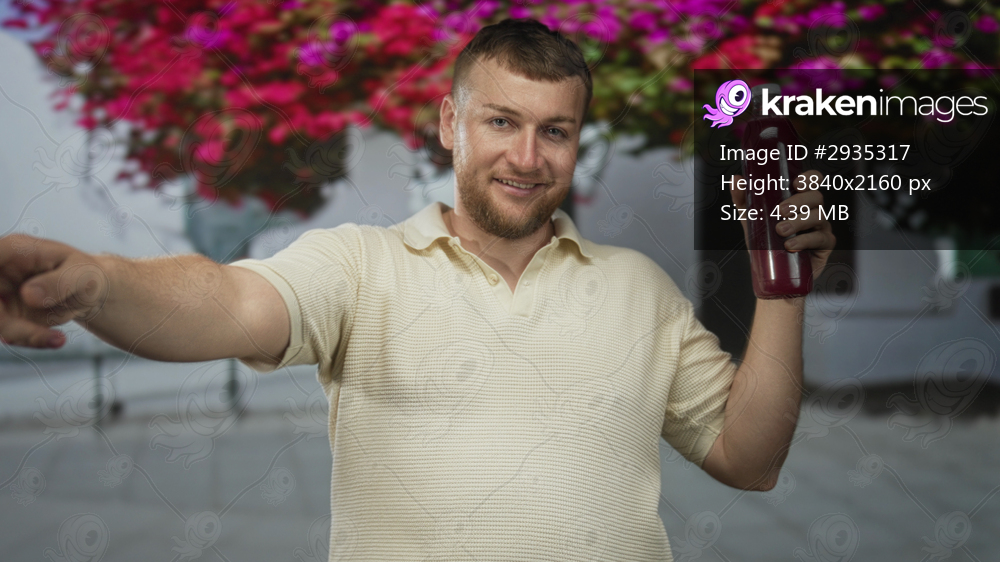 Man holds bottle of juice in right hand on street by white building with bright bougainvillea, smiling at camera; cheerful moment.