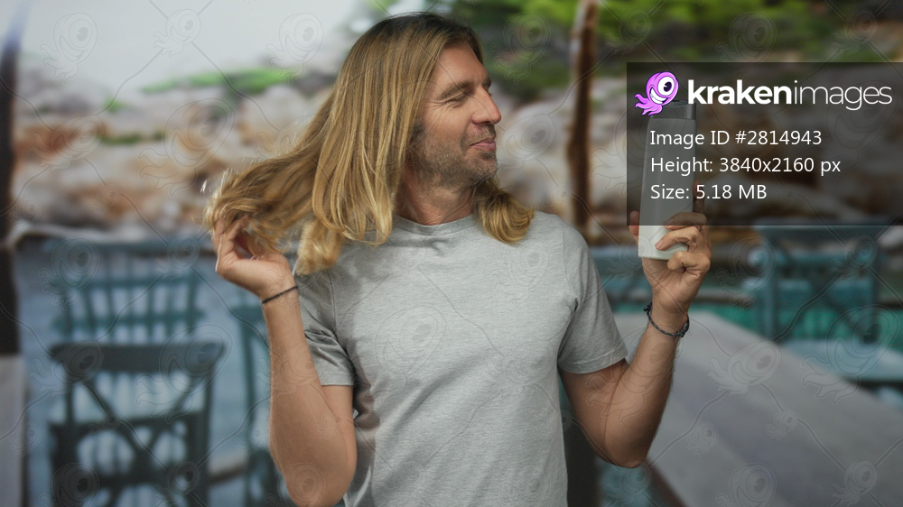 Man holds bottle and smiles while touching hair on street terrace; relaxed happiness casual leisure.