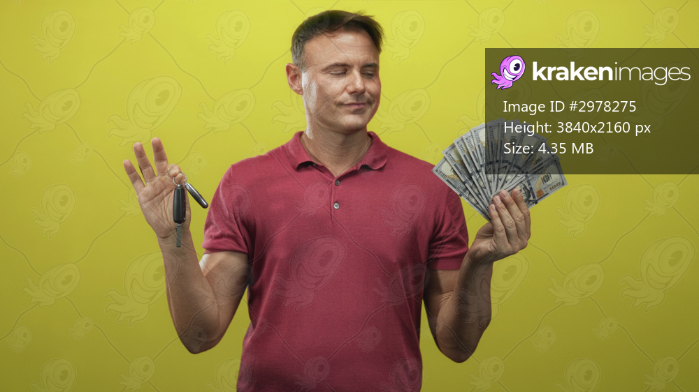 Man holds car keys in one hand and fans hundred dollar bills with the other in studio; confidence success wealth.