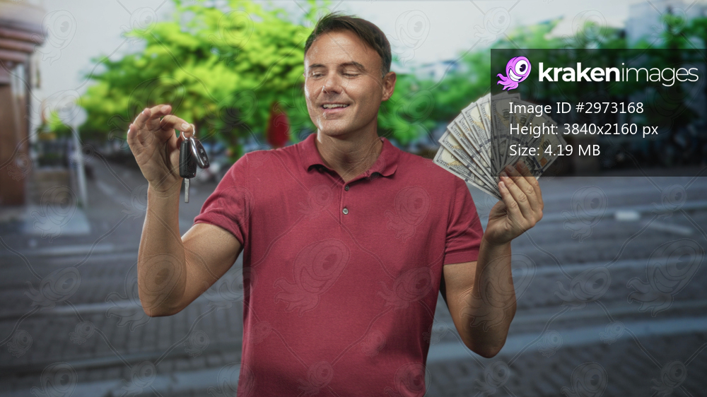 Man holds car keys in right hand and fans a stack of cash with left hand in a studio; transaction success deal.