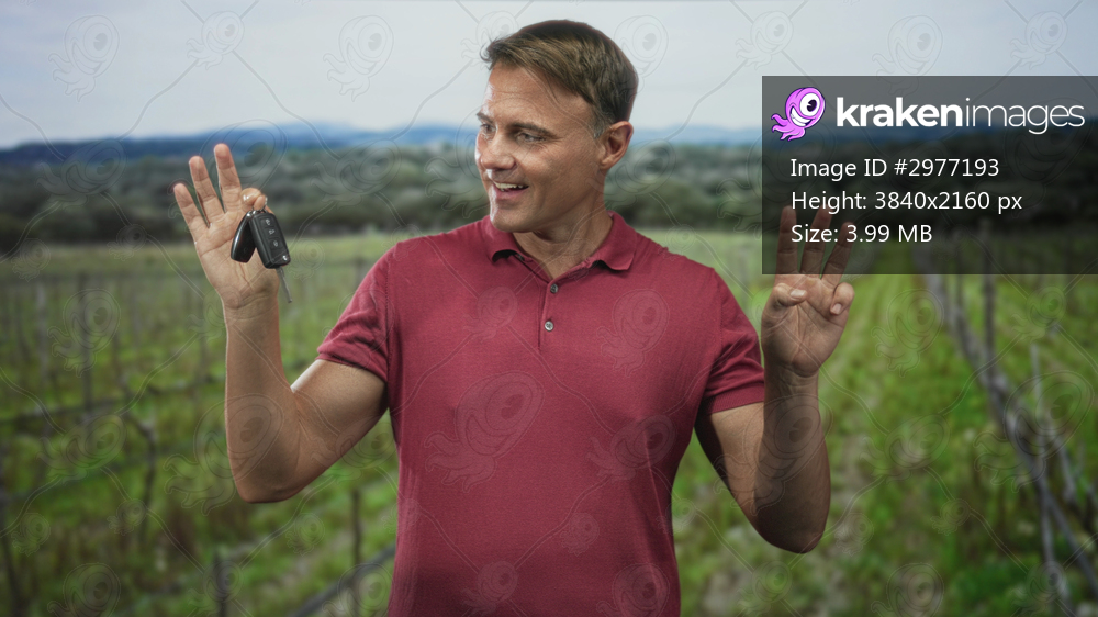 Man holds car keys and shows three fingers in a vineyard by a forest with rows of vines; confidence ownership.