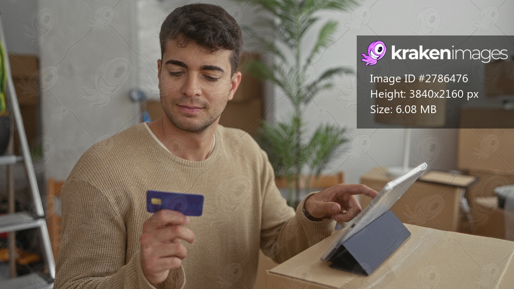 Man holds card after pointing around home as hispanic guy finishes moving purchase checkout unpack tasks.