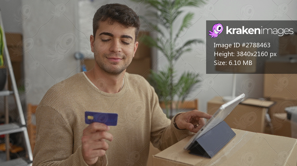 Man holds card after pointing around home as hispanic guy finishes moving purchase checkout unpack tasks.