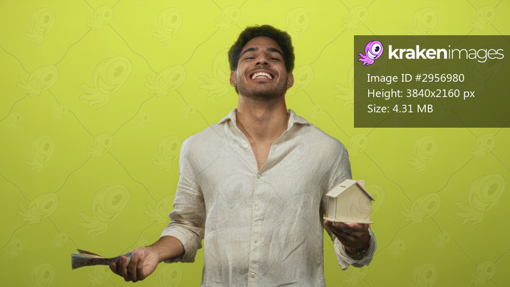Man holds cash and a small wooden house with hands while smiling and laughing in studio; home buying joy.