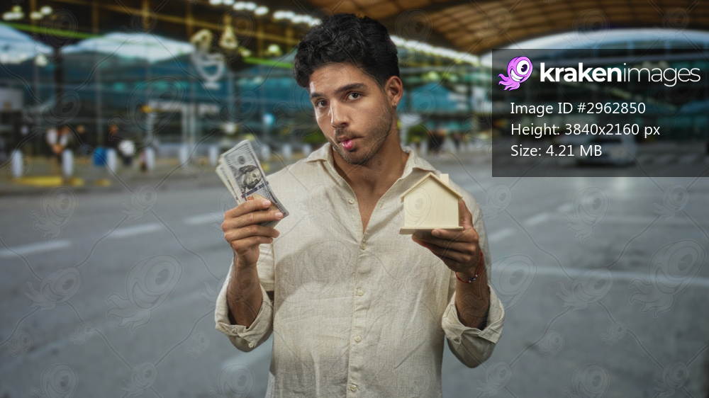 Man holds cash and a small wooden house model in his hands at airport curb while looking unsure; uncertainty decision.