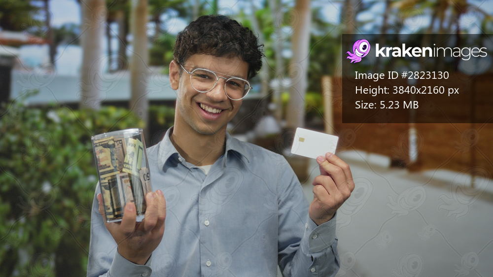 Man holds cash jar filled with bills and blank card with both hands outside building entrance; optimism prosperity savings.