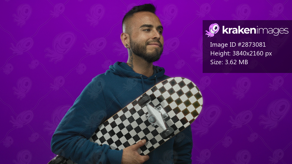 Man holds checkered skateboard close to chest, hand gripping deck edge, slight smile, in vibrant purple studio; confidence youth culture.